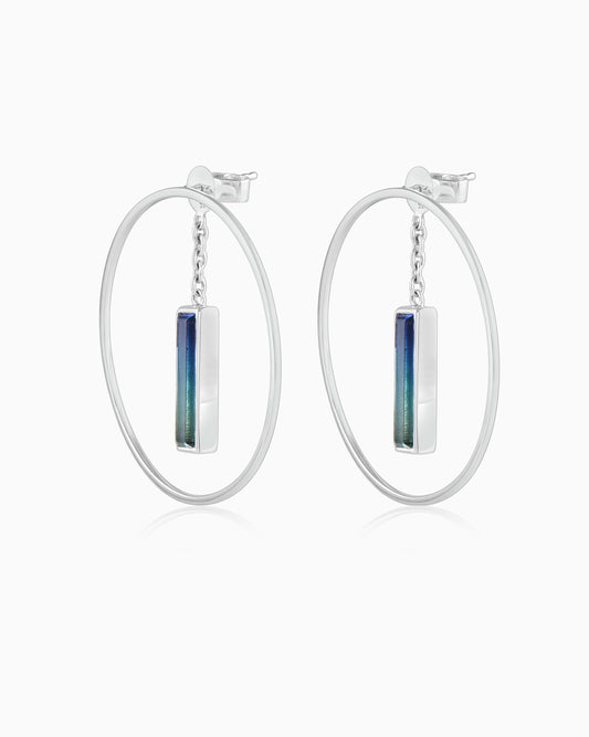 Elegant Quartz Doublet Bi-color Baguette dangling inside a Silver hoop. Pair these with your dresses or a formal look for evening gatherings. Designed to go with denim jackets or tubes as they hang perfectly from your ear lobule.