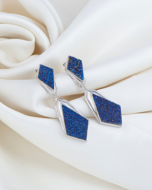 Elevate your style with the modern elegance of these sapphire druzy chain drop earrings. Crafted in high-quality sterling silver, each earring features a shimmering sapphire druzy stone at the base, radiating deep blue brilliance with a natural sparkling texture.
