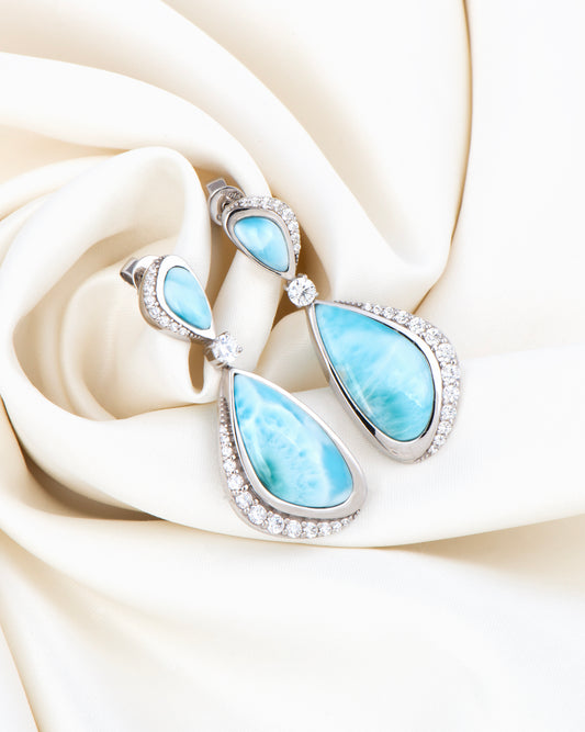 Make a timeless statement with these exquisite earrings, featuring the calming beauty of Natural Larimar, gemstones framed in elegant sterling silver. The design showcases teardrop-shaped Larimar stones accented with sparkling cubic zirconia, creating a harmonious balance of ocean-inspired hues a...