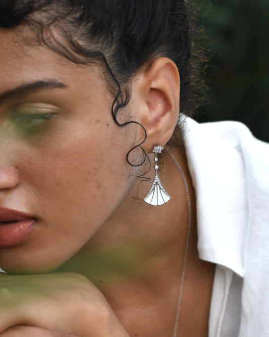 The Ivory Enamel Cascade Earrings weave silver and enamel into a composition of restraint and elegance. Handcrafted with rhodium-plated brilliance, their ivory gleam captures the serenity of moonlit nights. Though delicate in wear, they resonate with maximalist artistry: a purity that is timeless...