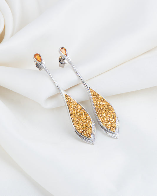 The Golden Petal Drusy Earrings capture the subtle shimmer of dawn in precious drusy stones. Each elongated teardrop frames the golden sparkle with clean, flowing lines, balancing boldness and delicacy. Minimalist yet radiant, these earrings play with texture and light, perfect for those who favo...