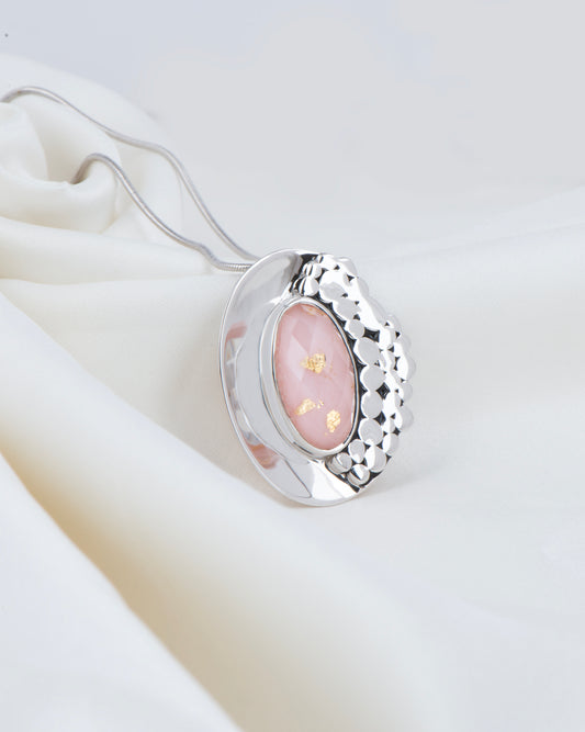 We tried depicting the world map in pink by hand crafting a fusion of Doublet Pink Opal With Gold Foil, Quartz doublet and Gold foil, making this design one of our most unique and a designer signature. It can be styled with jeans and summer dresses for a complete look. Â *All pendants come withou...