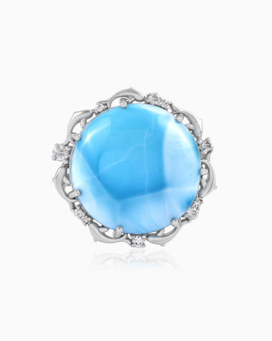 Featuring a large, round Natural Larimar, stone at its center, this ring showcases the ocean-inspired beauty of the stone. The smooth, round shape and calming hues make it a peaceful yet bold addition to any collection.