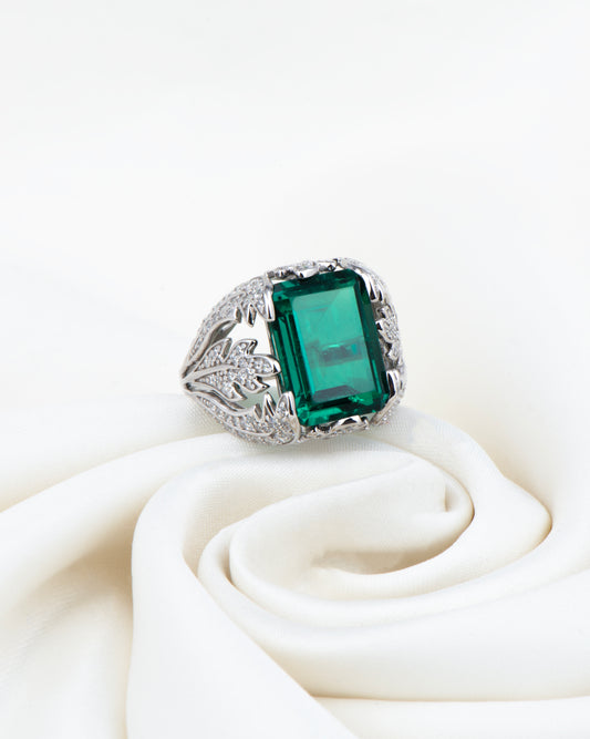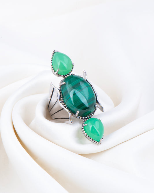This bold statement ring features a striking malachite gemstone at its center, flanked by two vibrant chrysoprase stones on either side. The rich green hues of the Natural Malachite, and Natural Chrysoprase, stones are set in a beautifully detailed silver band, with elegant leaf-like accents that...