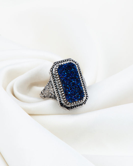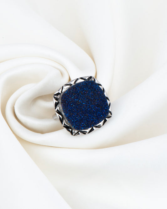 Petit design with unique Sapphire Drusy Ring, A mighty Sapphire Drusy in a Ring with a detailed collet. A statement piece to set the mood at a gala evening, intricately designed to go with all things elegant.
