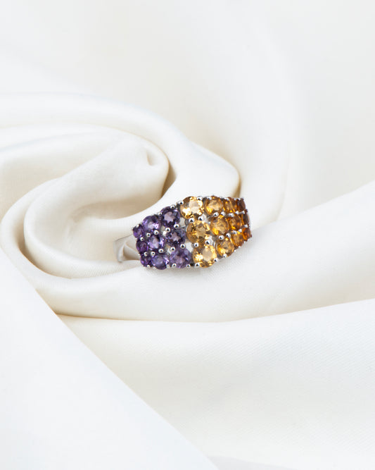 A mesmerizingNatural Amethyst,andNatural Citrine,Ring with a shiny gradient to show off your beautiful hands. A unique cluster of stunning colors to make any look tetradic.