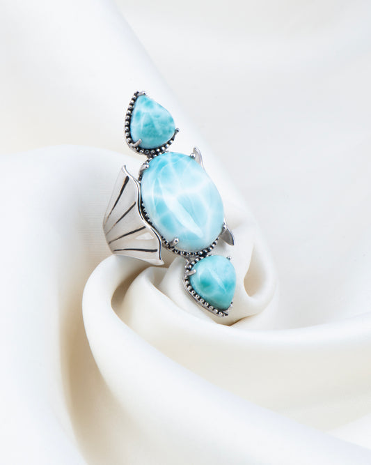 This stunning ring showcases the serene beauty of Natural Larimar, gemstones, featuring an oval-cut centerpiece flanked by two pear-shaped stones. Set in rhodium plated sterling silver with intricate detailing, the soft sky-blue hues of Larimar evoke the calming essence of tropical waters. Perfec...