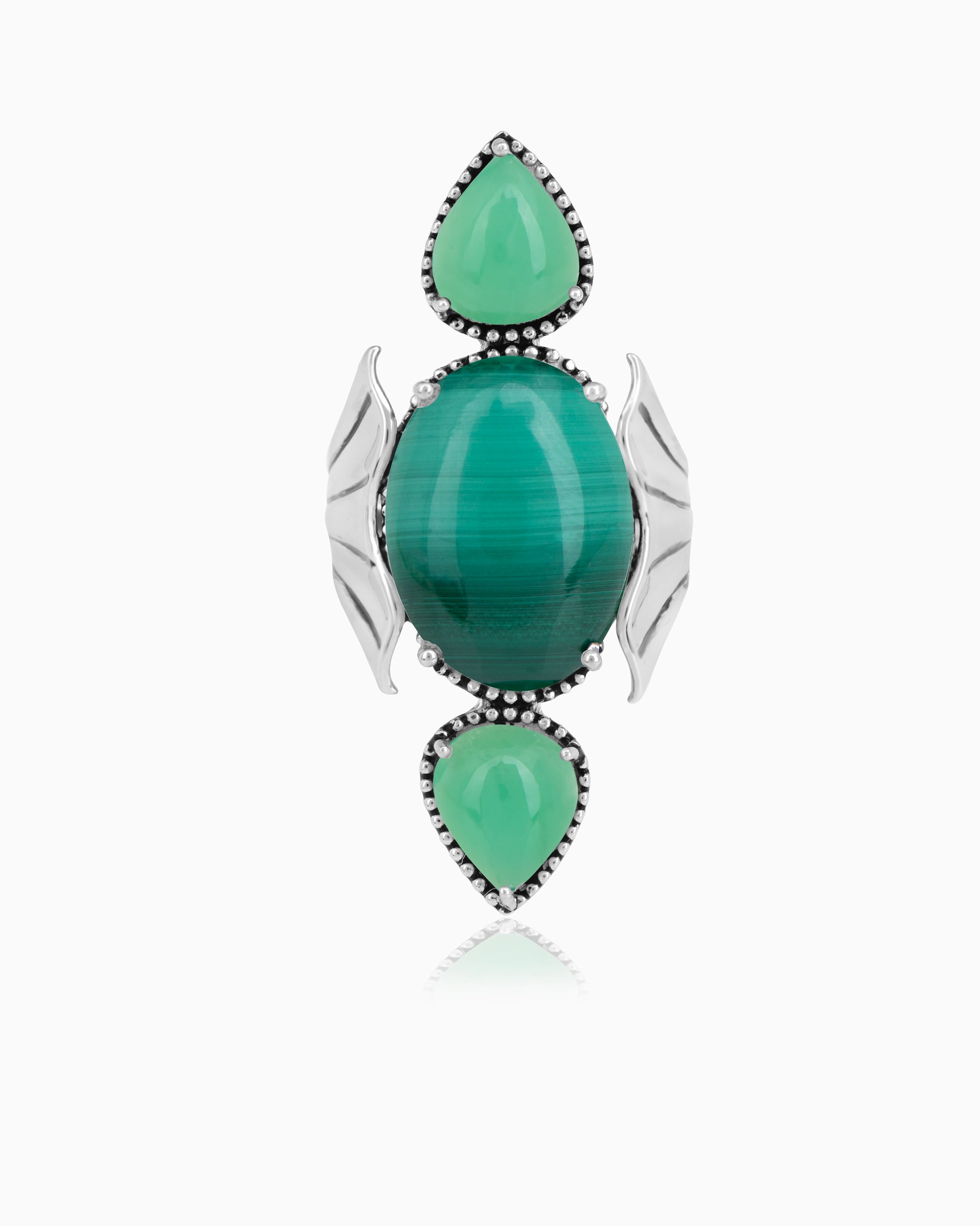 This bold statement ring features a striking malachite gemstone at its center, flanked by two vibrant chrysoprase stones on either side. The rich green hues of the and stones are set in a beautifully detailed silver band, with elegant leaf-like accents that add a touch of nature-inspired charm. Perfect for making a statement, this ring is ideal for adding an eye-catching pop of color and sophistication to any outfit, making it a must-have for gemstone lovers and fashion-forward individuals.