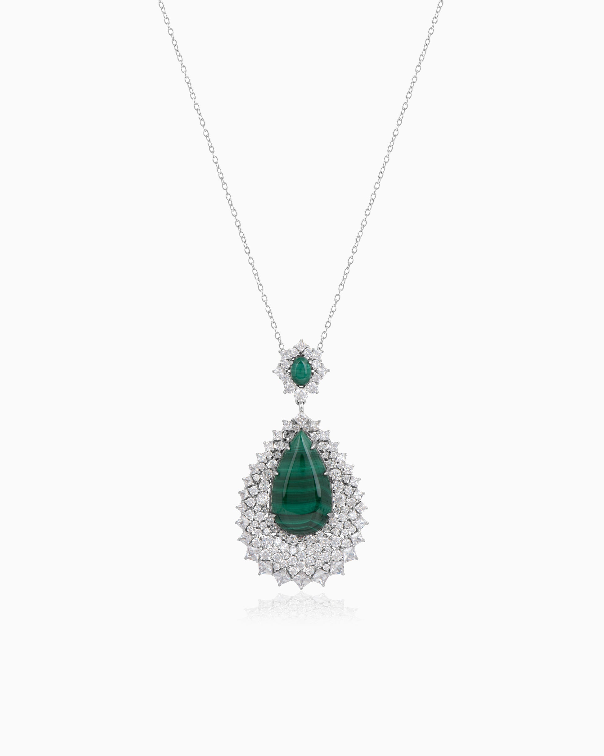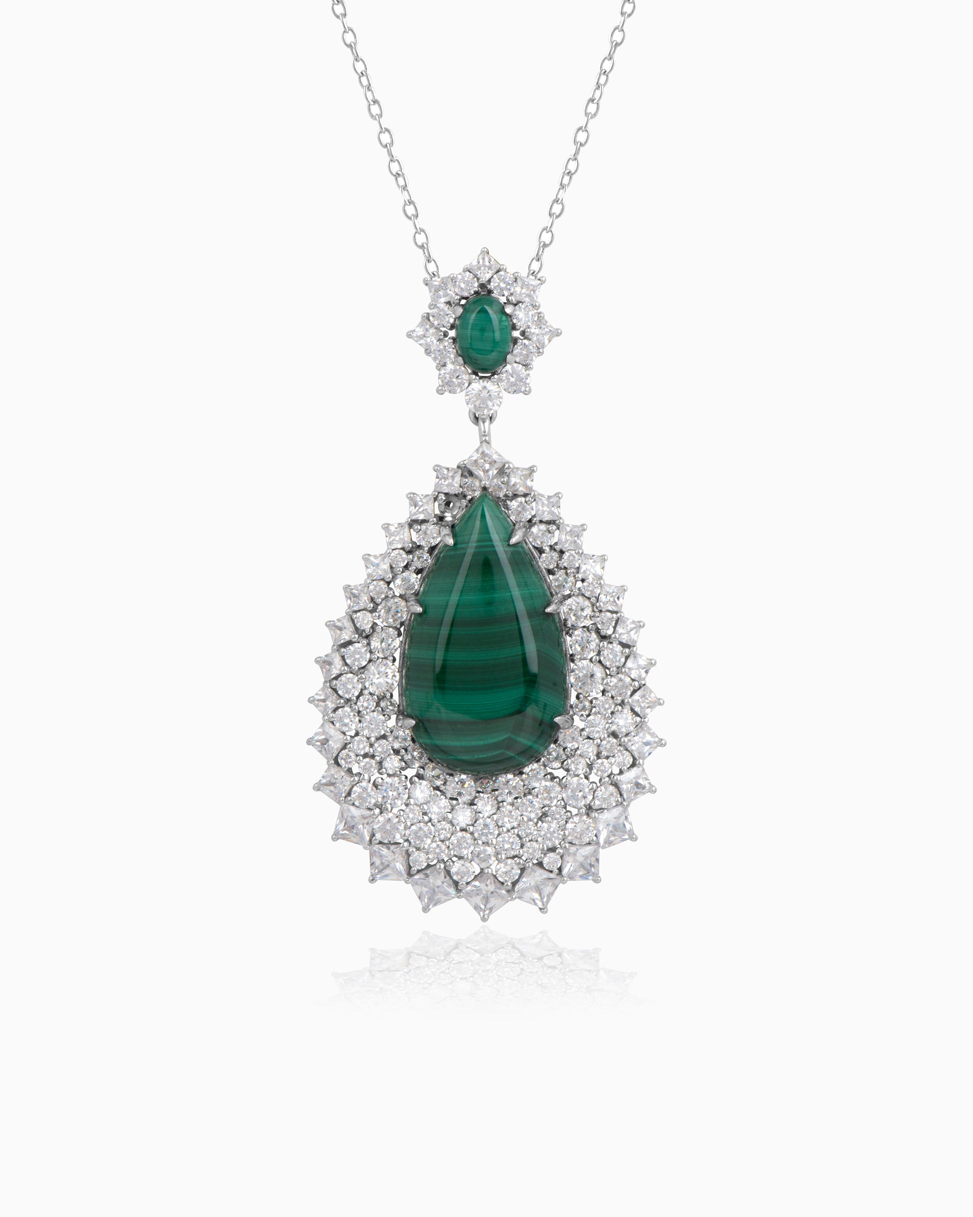 Radiating elegance and sophistication, this & Cubic Zirconia pendant is a true statement of luxury. The centerpiece features a bold pear-shaped malachite, showcasing its rich green banding and natural beauty. Surrounding it is a lavish halo of brilliant cubic zirconia stones, arranged in multiple layers to create a sparkling, starburst effect.