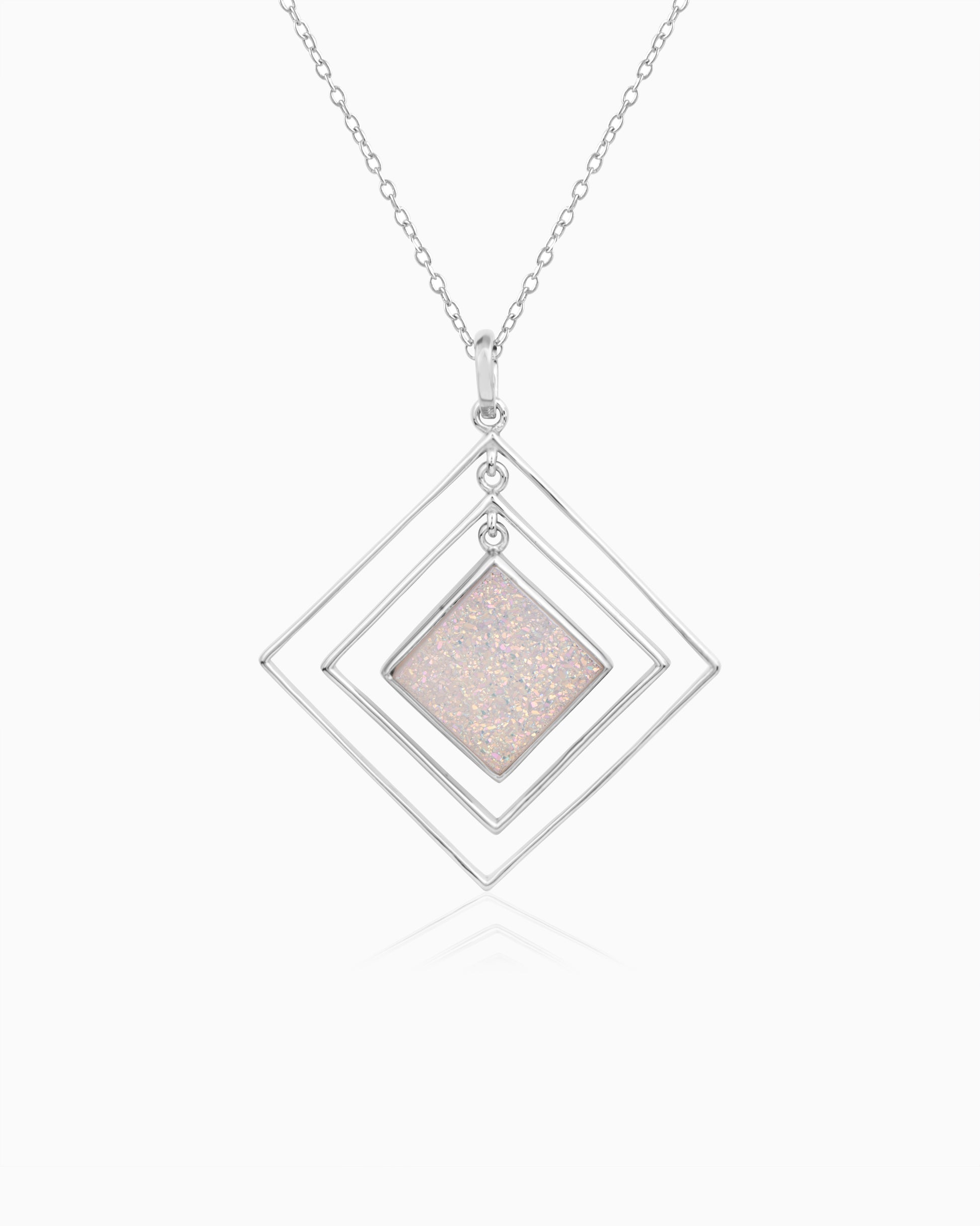 This stylish pendant features a stunning pink pearl druzy stone set within a modern geometric design. The shimmering druzy catches the light beautifully, with the soft pink hue adding a delicate, feminine touch. Surrounded by sleek silver frames, this piece combines elegance and contemporary style, making it the perfect accessory for any occasion. Whether worn casually or for a night out, the pink pearl druzy pendant adds a touch of sophistication and sparkle to your ensemble.