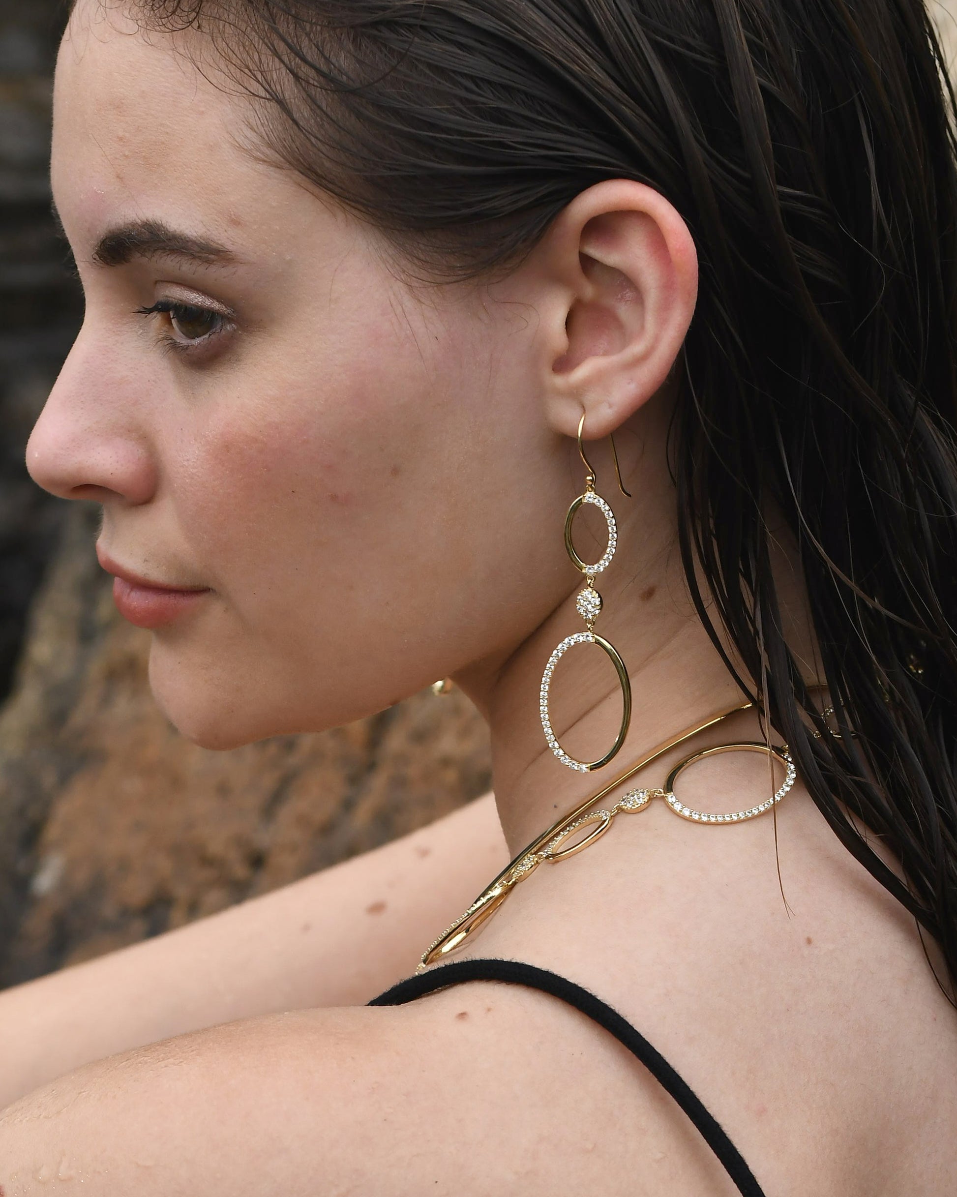 The Lumen Earrings – Gold Edition move like liquid sunlight. Interlinked oval loops shimmer with alternating textures, capturing fluidity and quiet strength. A circle of light that dances with every movement, perfect for evenings that linger in memory.