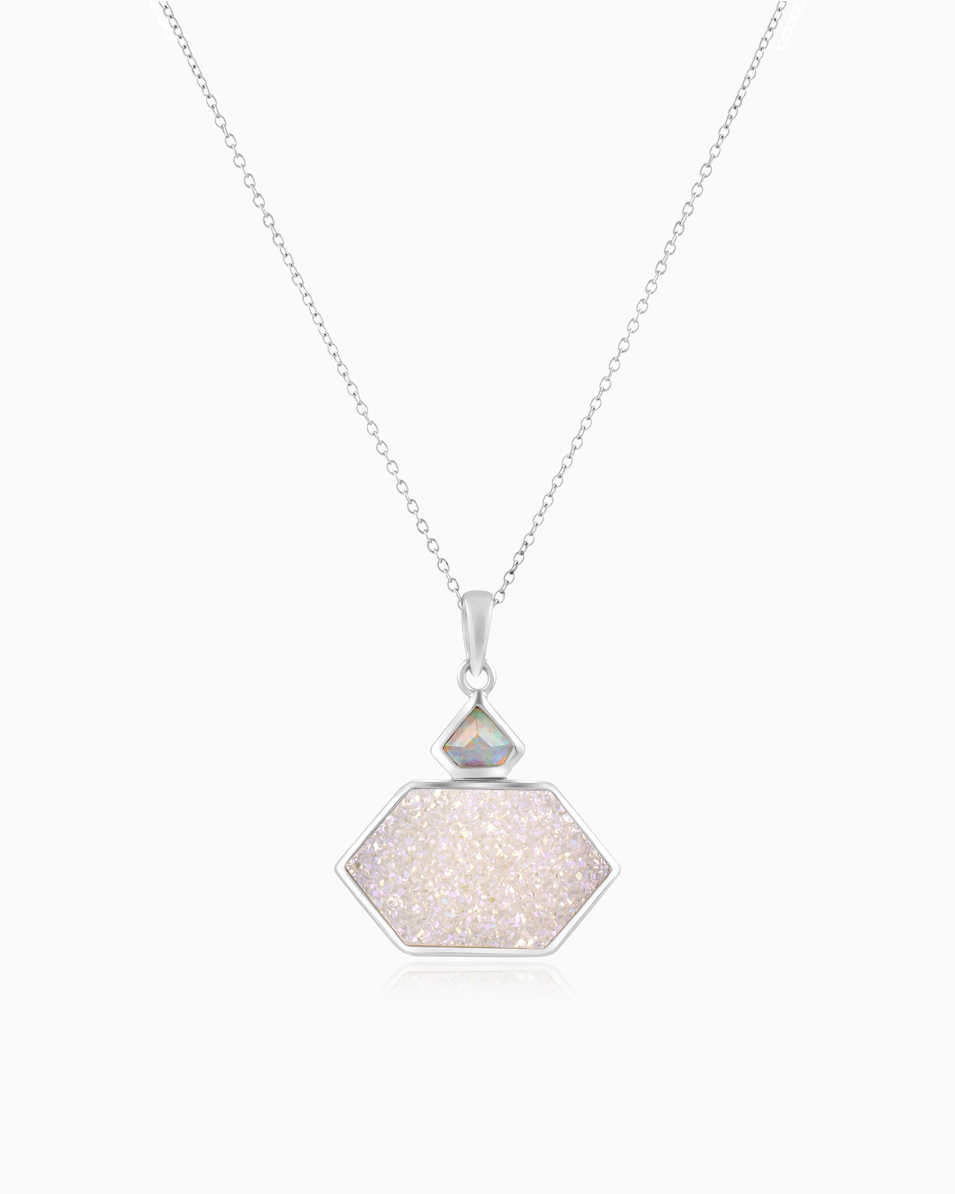 Elegant  Pink Pearl Druzy and White Opal Doublet Pendant cut in capriccio.  This exclusive piece can come handy to make your vintage outfit more alpha gen.