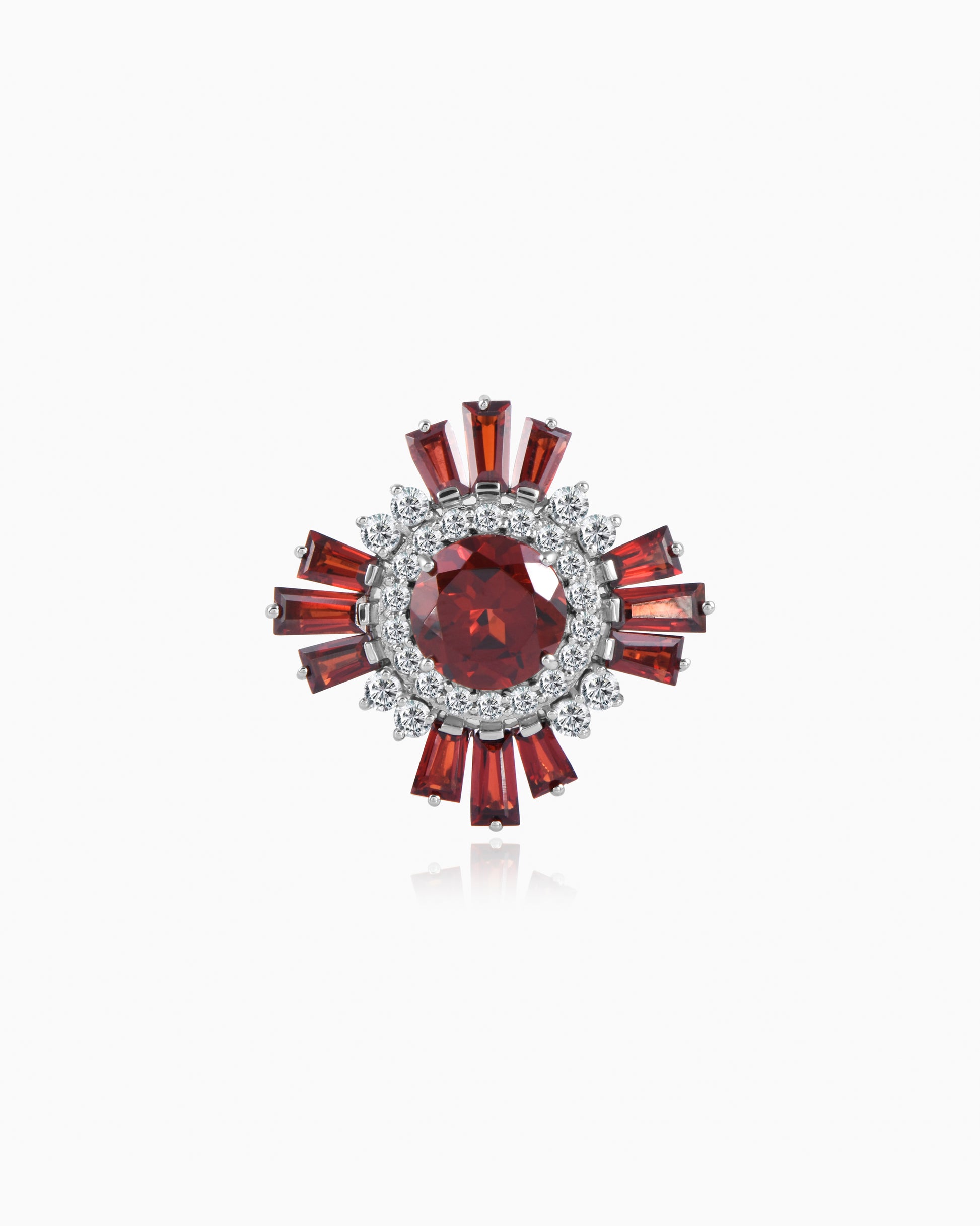 Signature from our Petrichor collection, Make a bold statement with this exquisite garnet and cubic zirconia ring, where timeless elegance meets modern sophistication. The centerpiece features a rich, deep red garnet, symbolizing passion and strength, meticulously cut to showcase its natural brilliance. Surrounding the garnet are dazzling cubic zirconia accents, carefully set to enhance the gemstone's fiery glow. Crafted in sterling silver, this ring blends luxury and durability, offering an eye-catching sparkle for any occasion.