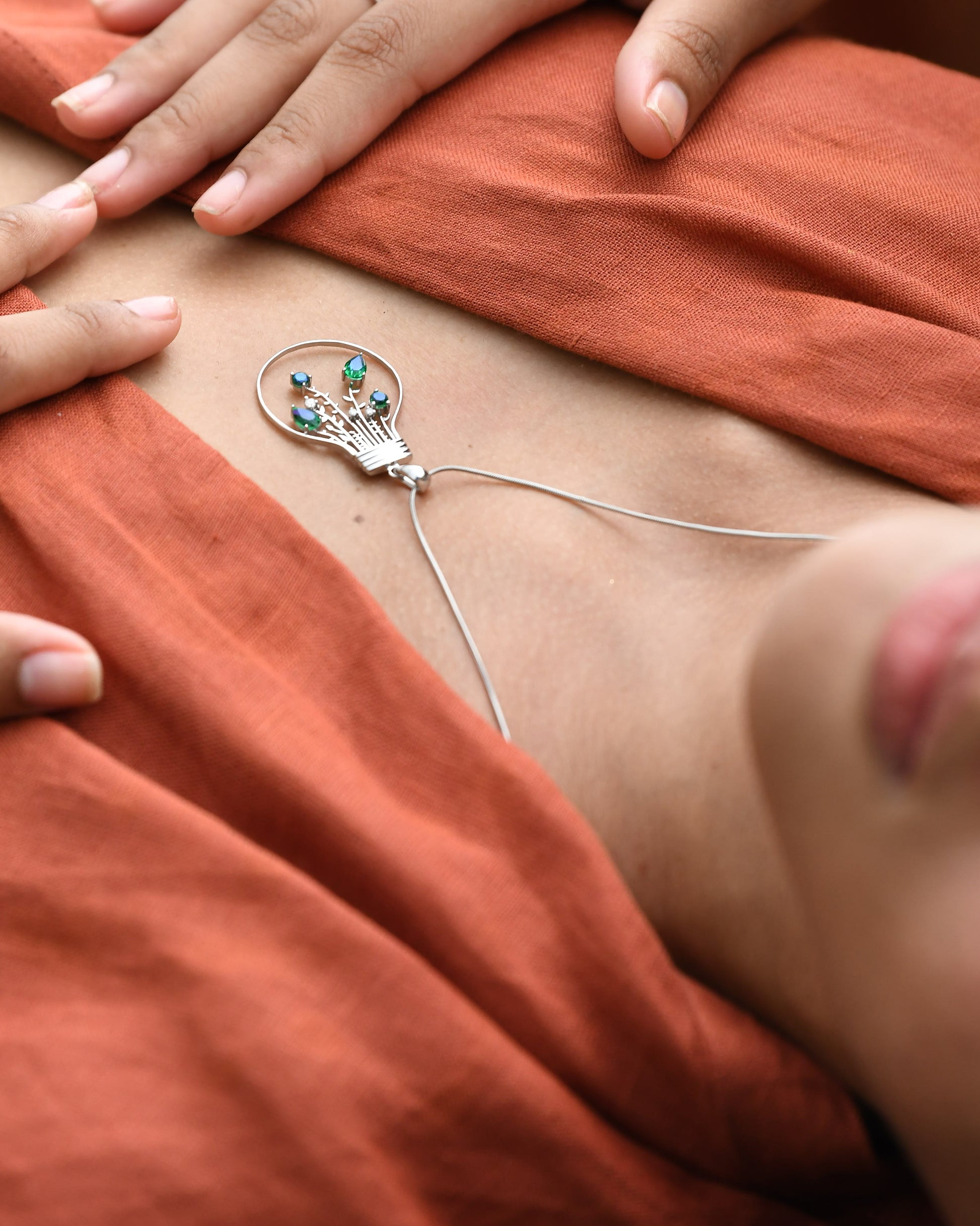 This stunning bulb-shaped silver pendant features a captivating pear-shaped celestial caribbean quartz stone, radiating a beautiful play of colors. The unique bulb design adds a modern touch, while the celestial stone brings a sense of mystique and elegance. Perfect for layering or wearing alone, this pendant is a versatile accessory that can elevate any outfit, making it ideal for both casual and special occasions.