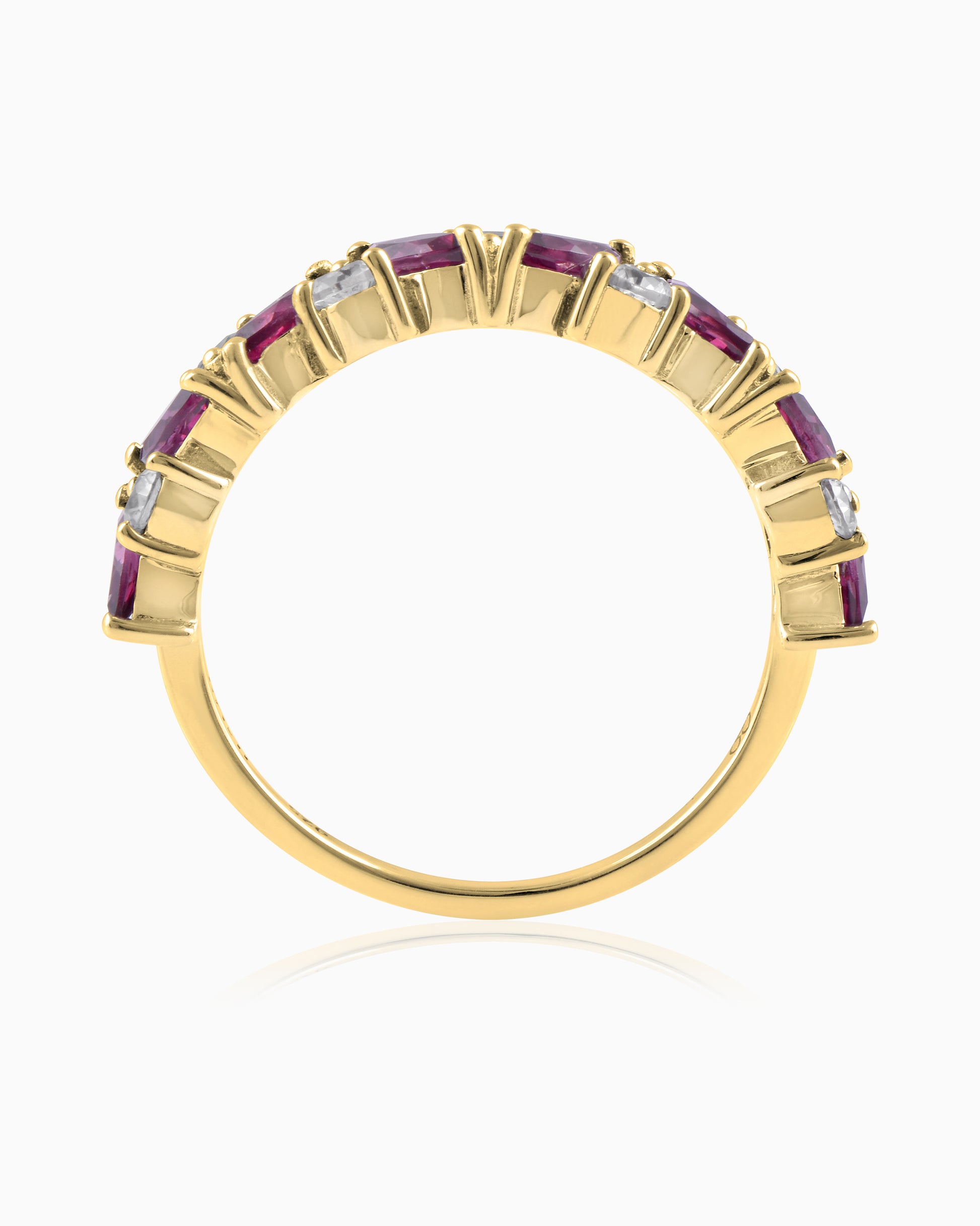 The Raspberry Glimmer Rhodolite Ring features alternating marquise stones and white stones in a stunning band. This design showcases the vibrant pinkish-red hue of rhodolite, perfect for adding a touch of color and sophistication.