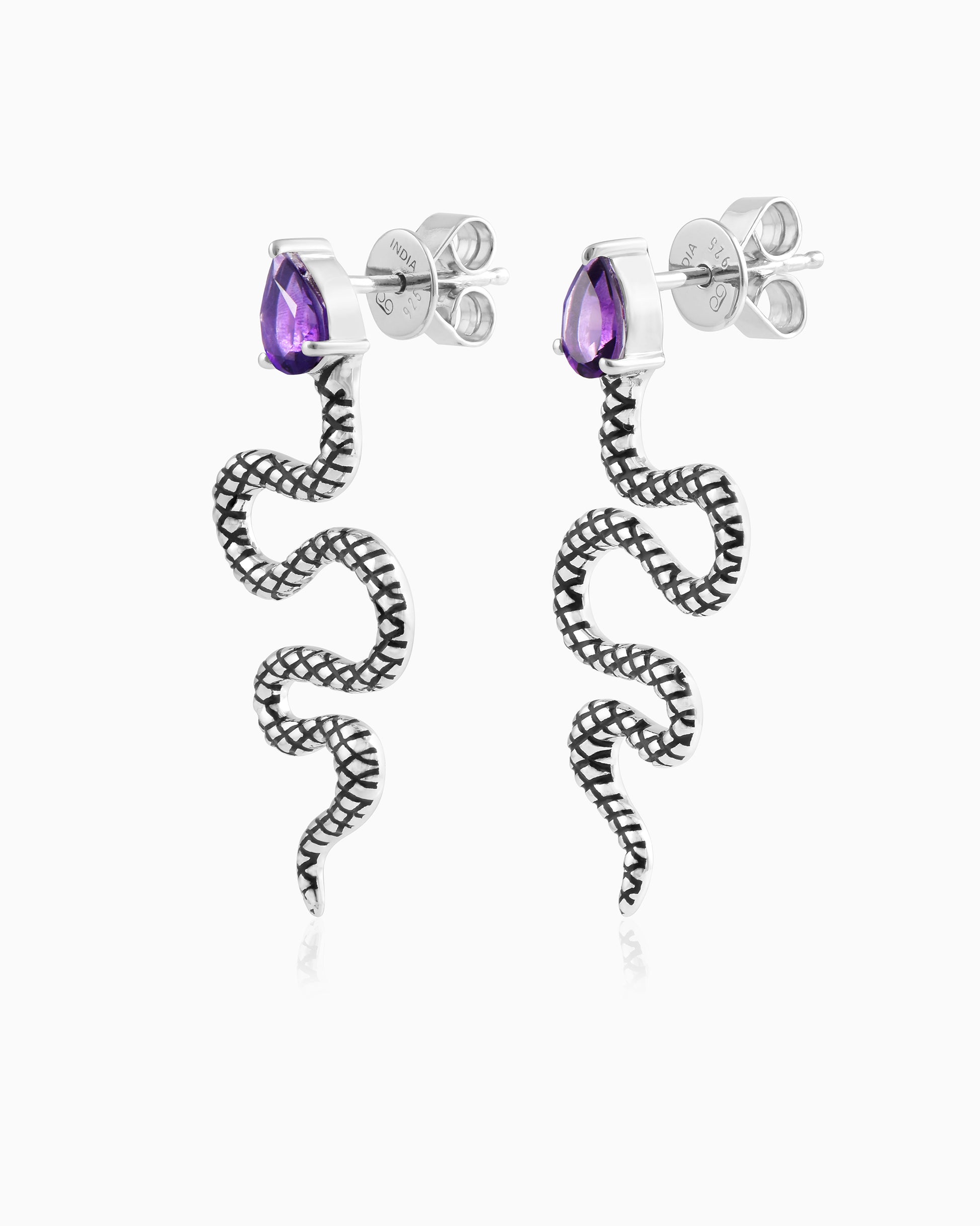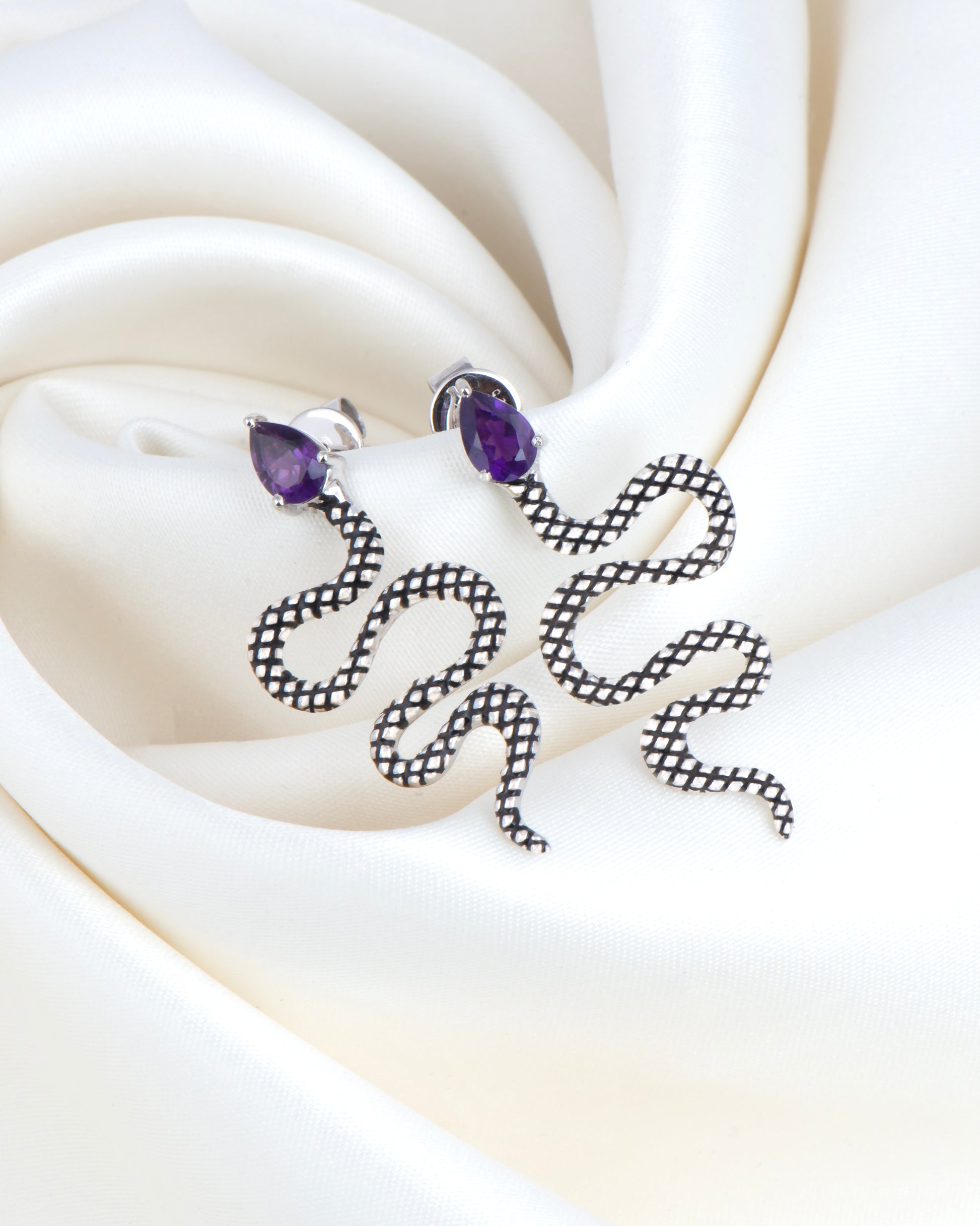 These captivating snake-shaped silver earrings feature vibrant adding a rich pop of purple to the sleek, coiled design. The smooth silver complements the deep hues of the amethyst, creating an elegant yet edgy accessory, perfect for adding a bold statement to any outfit.