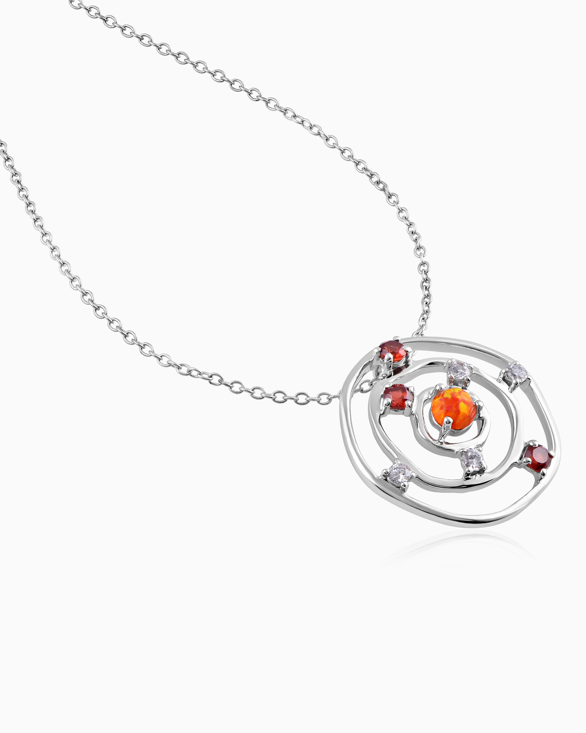 A designer delight special for the days when you want to break a routine. This natural garnet and Synthetic Fire Opal Studded pendant is intricately hand crafted for a personalized look. Feel free to pair it with your stack chains and petit pendant.