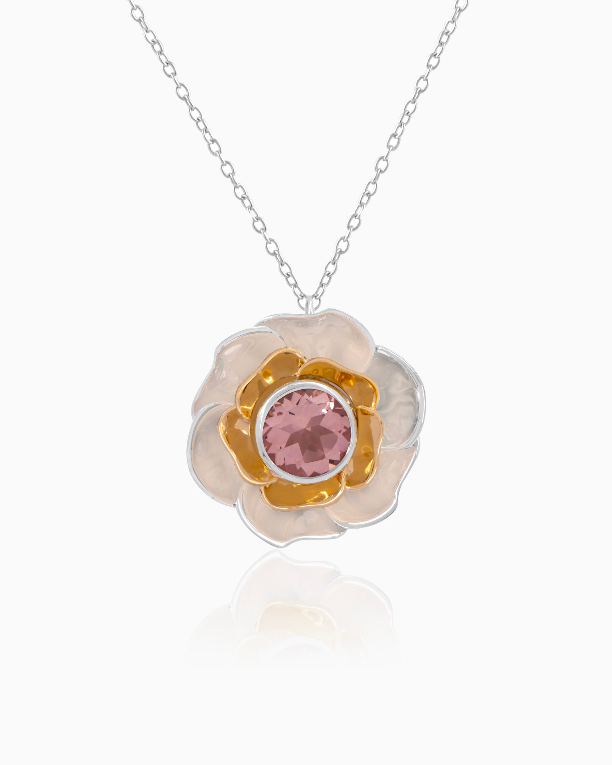 This unique and modern Sunrise Bloom Pendant features a stunning Quartz Doublet Celestial stone in a beautiful Morganite color. Handcrafted with attention to detail, this pendant offers a touch of elegance and sophistication to any outfit.